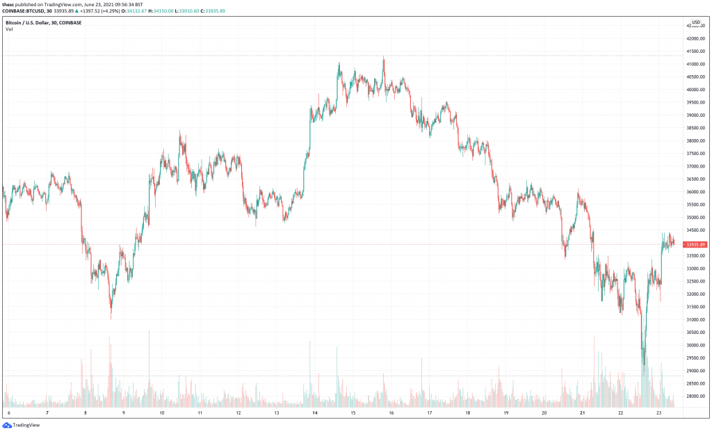 Bitcoin’s dominance has also increased amid the market’s bearish moves. It’s now up to 47%, having been as low as 39% on May 19. This underlines its role in steadying the market as it goes through a period of recuperation and recovery. And at $34,000, it is now some 45.6% below the 11-year trend price established by Pantera Capital in a recent report. In other words, traders have the opportunity to buy it at a considerable discount, relative to historical indicators of where its price ‘should’ be.