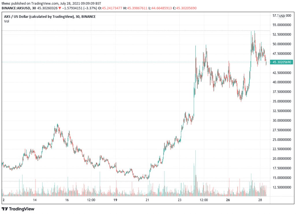 It’s probably not long before AXS becomes a top-20 cryptocurrency. At $46.73, it has risen by 15% in 24 hours and by just over 200% in a week. It also broken its all-time high yet again yesterday, topping $52 before coming back down to its current level. It’s also up by 125% in the past fortnight and by over 1,100% in the past 30 days.