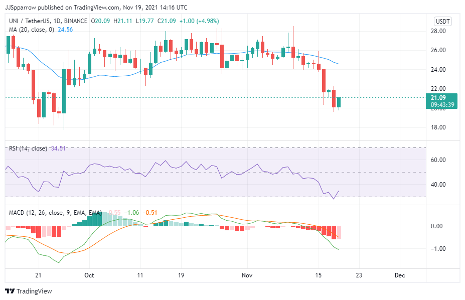 Price-wise, UniSwap’s governance token UNI is trading at $21.09, up a modest 4.98% in the last 24 hours. This is despite the ongoing bearish momentum in the crypto market. Year-to-date, UNI has surged 309.31% while keeping a strong twelve-month trailing surge of 446.79%.