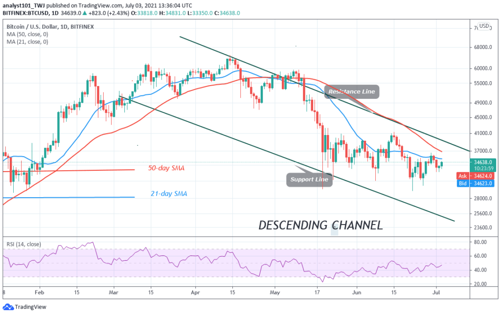 Bitcoin (BTC) has been in a downward correction since May 19 as the king coin fluctuated between $31,000 and $41,273 price levels. However, BTC/USD is now confined in a tight range between $31,000 and $35,000. The crypto’s upward move has been restricted below $35,000 high as buying dries up at the resistance zone. For example, today buyers are struggling below the $35,000 resistance to break above it. If they are successful above the resistance zone, Bitcoin will rise to retest the $41,273 high. This will be an uphill task as Bitcoin lacks buyers at higher price levels. Presently, Bitcoin is facing rejection at the $35,000 resistance zone. If the market faces rejection at the recent high, the Bitcoin range-bound move will continue for few more days.
