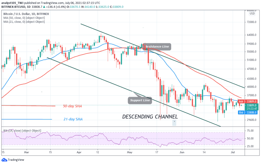 Meanwhile, BTC’s price is resuming upward after falling to the low above $33,200 as Bitcoin corrects upward – July 3, 2021. Since June 22, BTC’s price has been confined to fluctuate between $31,000 and $35,000. On the upside, if the bulls break the $35,000 high and the bullish momentum is sustained, Bitcoin will rally to retest the $40,000 to $42,500 resistance zones. Nonetheless, if the Bitcoin bulls clear the resistance zones, it will signal the resumption of upside momentum. Conversely, if the bears break below the $31,000 support, there will be panic buying and selling if Bitcoin declines to $28,000 or $20,000 low.