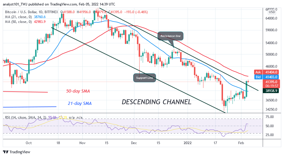 On February 4, Bitcoin’s (BTC) price rebounded above the $37,000 support as the cryptocurrency rallied to a high of $41,753. The largest cryptocurrency has almost reached the targeted price of $44,000 high. The bulls broke above the 21-day line moving average but it is below the 50- day line moving average. On the upside, if the bullish momentum extends above the 50-day line moving average, BTC price will rally above the $50,000 psychological price level. Today, the upward movement of price has been stalled below the $42,000 resistance. BTC price is fluctuating below the recent high. Presently, BTC’s price is at level 56 of the Relative Strength Index for period 14. It indicates that Bitcoin is in the uptrend zone and capable of further upside movement.