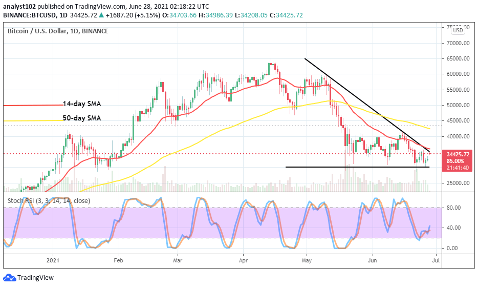 The BTC/USD daily chart currently depicts that the crypto’s worth gaps northbound away from a lower point above the support level of $30,000. The market presently averages $35,000, where both the smaller SMA trend-line and the bearish trend-line are southwardly underneath the 50-day SMA indicator. The Stochastic Oscillators have crossed the lines to the north slightly against range 40 to signify that a buy pressure is somewhat ongoing.