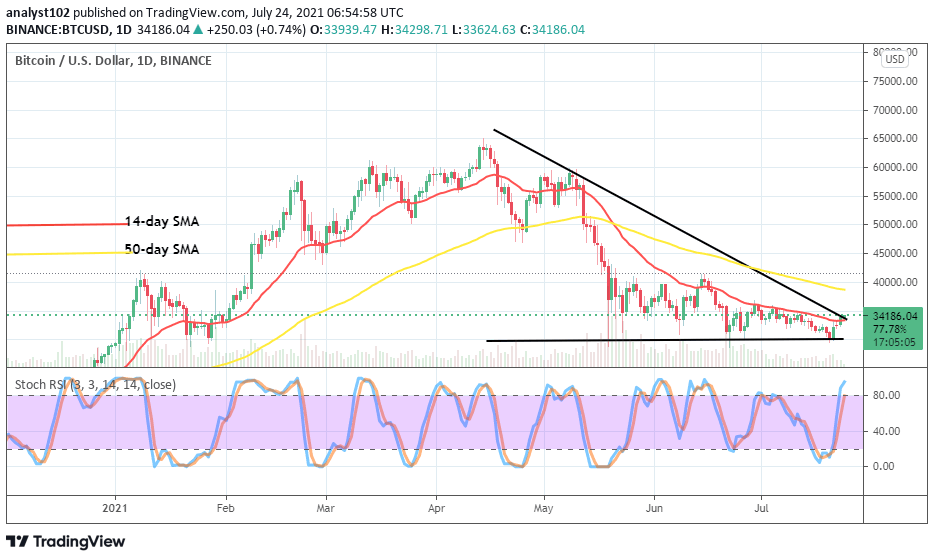 It is displayed on the BTC/USD daily chart that the crypto trade pushes close to the important value at $35,000 after a couple of several sessions, witnessing some downturns. The current northward pushes begun during July 21st trading time from around the critical support line drawn at $30,000 level. The smaller SMA trend-line has breached slightly northward to indicate that the crypto is on the rise. The 50-day SMA is over the14-day SMA. The Stochastic Oscillators have moved northbound into the overbought region in an attempt to close the lines in it. That indicates that the pressure to the upside is on a gradual reduction pace.