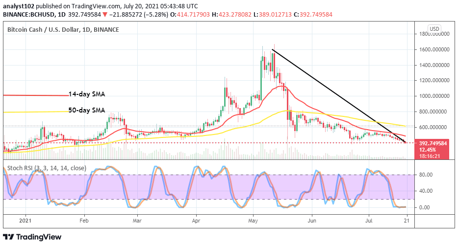 On the BCH/USD daily chart, the crypto market operation dumps at the lower range-line marked at $400. The Stochastic Oscillators are in the oversold region with their lines conjoined, indicating a consolidation moving manner in it. The formation of trading candlesticks has been forthcoming in a tinier succession order beneath the SMA trend lines. The 50-day SMA indicator is above the 14-day SMA indicator as the bearish trend-line drew downward across them. All those indicators’ reading portends that the crypto market hasn’t been able to swing against the current downward motion.