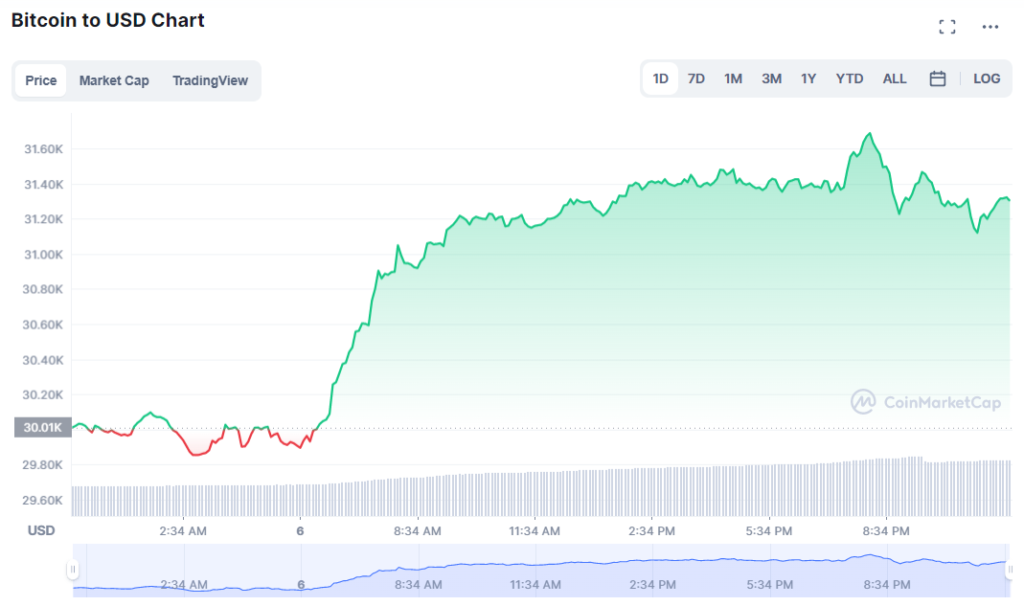 After around 5 hours or so, Bitcoin went back into the $29,000 territory, finally regaining momentum. After picking up pace, at $29,999, the cryptocurrency rose gradually, reaching a high of $31,689. At the moment, it is trading at a price of $31,232.