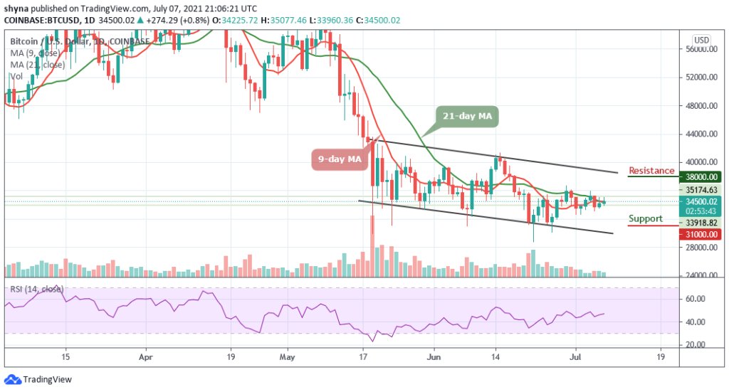 Looking at the 4-hour chart, the Bitcoin price is facing a downtrend and the coin may continue to depreciate if the $34,000 level is broken. The 9-day MA is likely to cross below the 21-day MA, the Bitcoin price may fall and could reach the critical support at $33,000, and below.