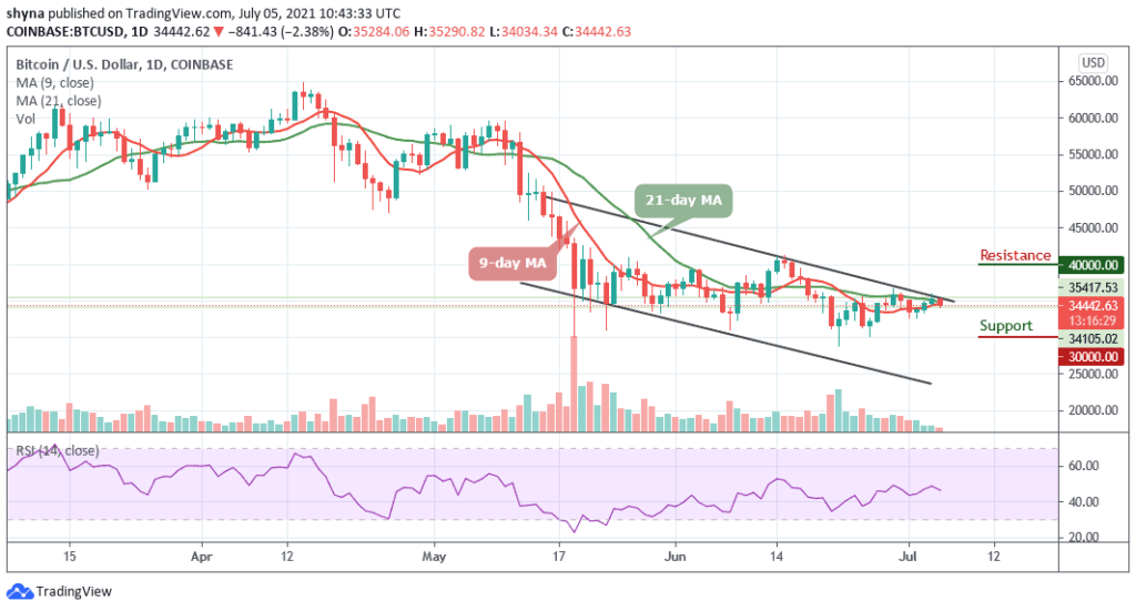 The Bitcoin price is currently trading below the 9-day and 21-day moving averages at support provided by a rising support trend line of the channel; however, a break of this trend line could cause Bitcoin to unwind toward the $33,000 level. However, the king coin is currently in a critical position with the next few days dictating the direction that it will head over the next 2 weeks. A drop beneath $33,000 could be detrimental to Bitcoin as it could lead the first digital asset towards the supports at $30,000, $28,000, and $26,000.