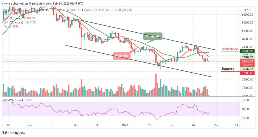 BTC/USD keeps struggling to maintain the $36,000 support level. If the coin fails to remain above this level, then, it could drop to the next support levels of $32,000, $30,000, and $28,000. From above, any bullish cross above the significant 9-day and 21-day moving averages could send the price towards the resistance levels of $42,000, $44,000, and $46,000.