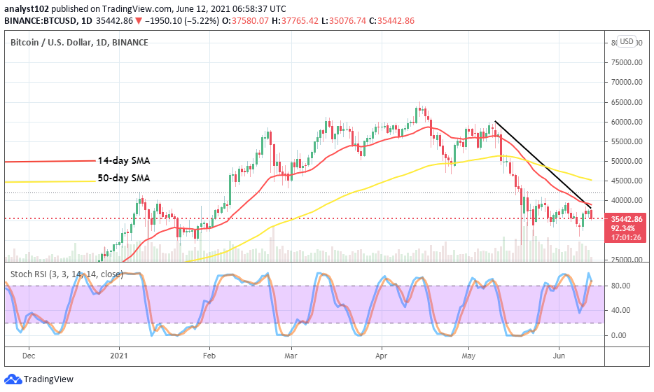 It is depicted on the BTC/USD medium-term chart that the market reverts upswing while it faces resistance between the values of $40,000 and $36,000. And, price has briefly breached southward past the lower line. All the trading tools are closely located around the current trading zone of the crypto market. The 50-day SMA indicator is located over the 14-day SMA as the bearish trend-line drew above them. The Stochastic Oscillators have crossed downward to make a slight entrance into the oversold region. That suggests that some pressures to the downside are on verge of getting exhausted. As a result, The values between $32,000 and $36,000 needed to be in focus as to where a sudden rebounding move is on a higher note of expectation to take place at a later time.