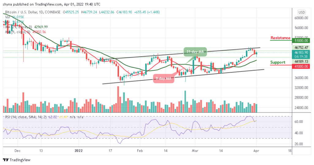 The Bitcoin price is retracing above the 9-day and 21-day moving averages as the market price prepares to cross to a higher level. In the meantime, any further bullish movement may increase the price above the upper boundary of the channel. Meanwhile, another resistance may come at $48,000 before reaching the potential resistance of $51,000, $53,000, and $55,000 levels.