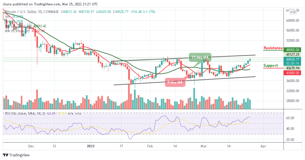 During the European session today, the Bitcoin price hovers above the crucial resistance level of $45,000. Meanwhile, on the upside, as the coin moves above both the 9-day and 21-day moving averages, little is in place to prevent correction targeting the key resistance of $46,000 as the technical indicator Relative Strength Index (14) moves above 60-level to confirm the uptrend.