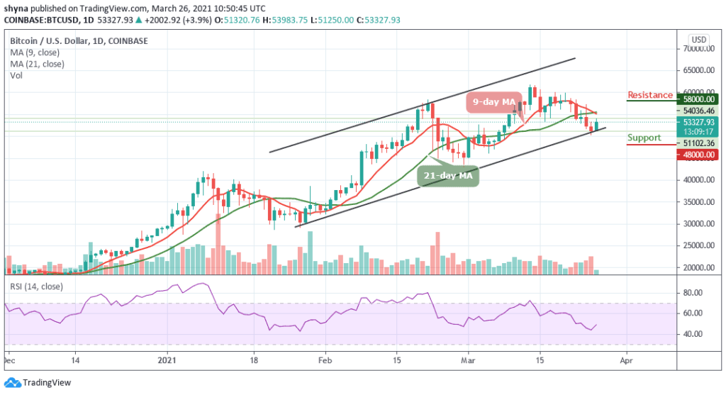 BTC/USD bulls begin to come into the market as the price remains below the 9-day and 21-day moving averages. At the time of writing, Bitcoin is seen gaining 3.9% to trade at $53,327. Meanwhile, despite correcting lower since the past few days, traders will be excited to see the king coin finally surpass the $55,000 psychological level.
