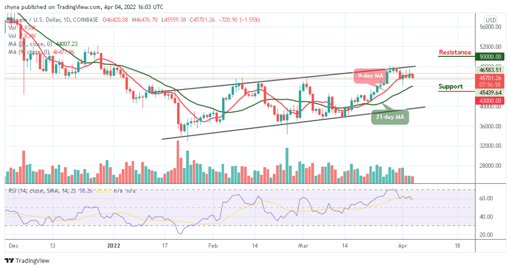 On the upside, recovery may not come easy as the coin would have to cross above the 9-day moving average. Meanwhile, a sustainable move above this barrier may locate the resistance level of $47,000, which may allow for an extended recovery towards the potential resistance levels at $50,000, $52,000, and $54,000. However, an increase in selling pressure across the market could bring the Bitcoin price towards the supports at $43,000, $41,000, and $39,000.