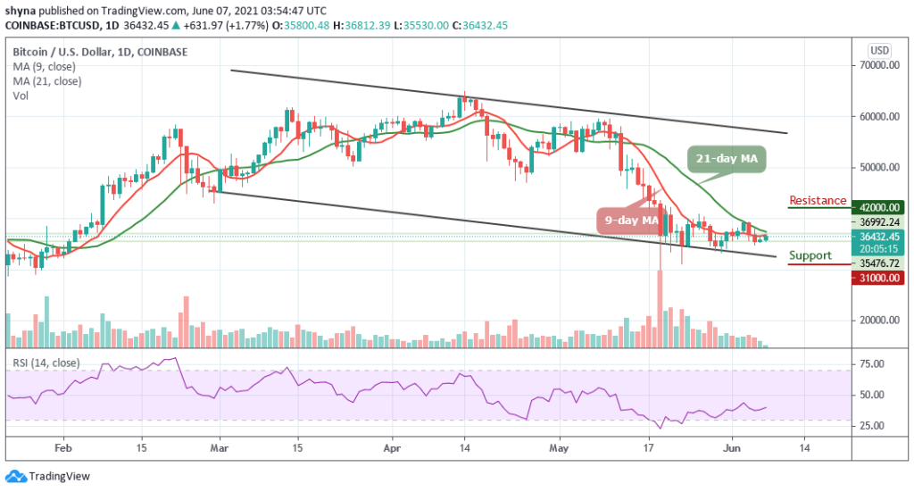 BTC/USD is currently recovering higher from the $35,000 support zone and the first digital asset must clear $37,000 resistance above the 9-day and 21-day moving averages to start a fresh increase in the near term. Looking at the daily chart, traders could see that BTC is yet to break above the 9-day moving average. The implication is that the market may drop to retest the $33,000 support. This is possible if the sellers reclaim the $35,000 crucial support level and in most cases, sellers may find penetration difficult at this level.
