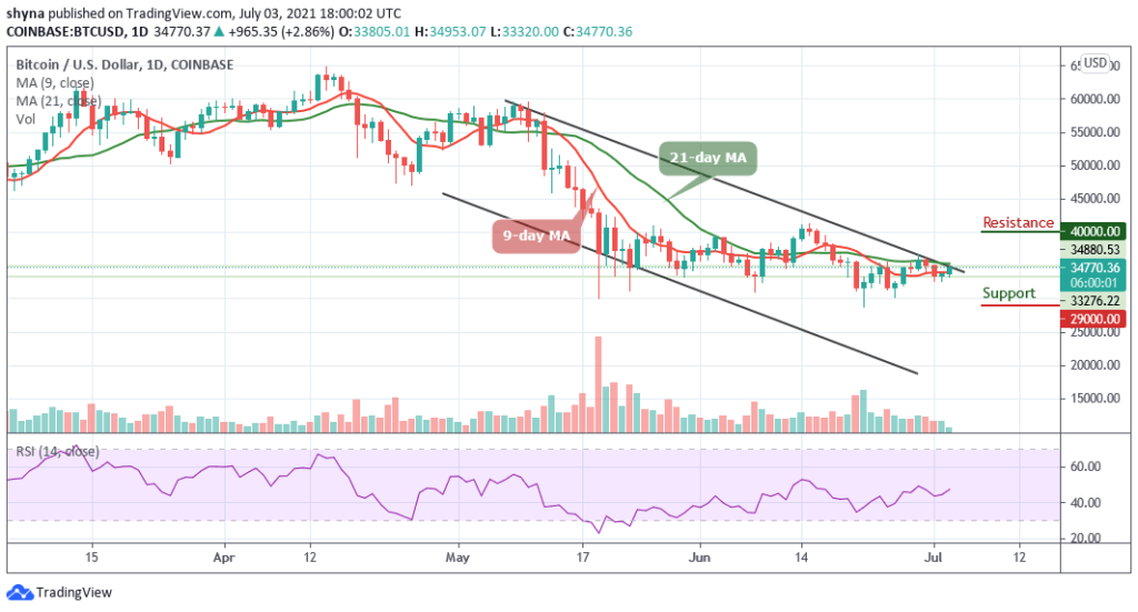 So far, the Bitcoin price successfully stays above the $34,000 level and continues to trade above the 9-day moving average but still below the 21-day moving average. Recently, the coin even spiked to touch the daily high of $34,953 during the early trading session as the technical indicator Relative Strength Index (14) remains above the 45-level.