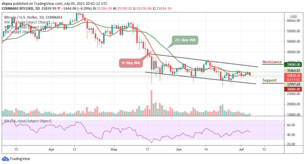 At the time of writing, the Bitcoin price is trading below the 9-day and 21-day moving averages at $33,834 with a decline of 4.09% on the daily price chart. However, looking at the declining daily volume candles, together with the steady but stable recent Bitcoin price action, traders can assume that a stronger negative move may be coming soon. At the moment, the Relative Strength Index (14) is seen moving below 50-level, which may likely create more downtrends.