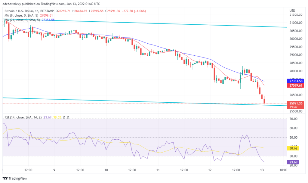 Also on the RSI indicator: for this chart, the faster RSI line has reached the oversold region, and the slower RSI line is very close to the oversold region. As it stands, for BTC/USD to rally, dip buyers are needed to wary out the bears faster. Finally, the activities of buyers will pull the price up to $27,000 and perharps$28,000 respectively.