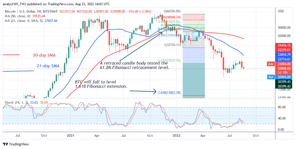 Following the recent decline on August 19, buyers have arrested the decline above the $20,000 psychological price level. For the past five days, the bears and the bulls are in price tussle as Bitcoin fluctuated between the $20,700 and $22,000 price levels. Today, Bitcoin is declining after a failed upward correction. The bears will attempt to retest and break below the current support. On the upside, if the bulls break the $22,000 resistance, the cryptocurrency will rally to the $24,000 high. Conversely, if the bears break below the current support, the market will resume a downtrend. Bitcoin will further decline to the lows of $18,912 and $17,605 price levels.