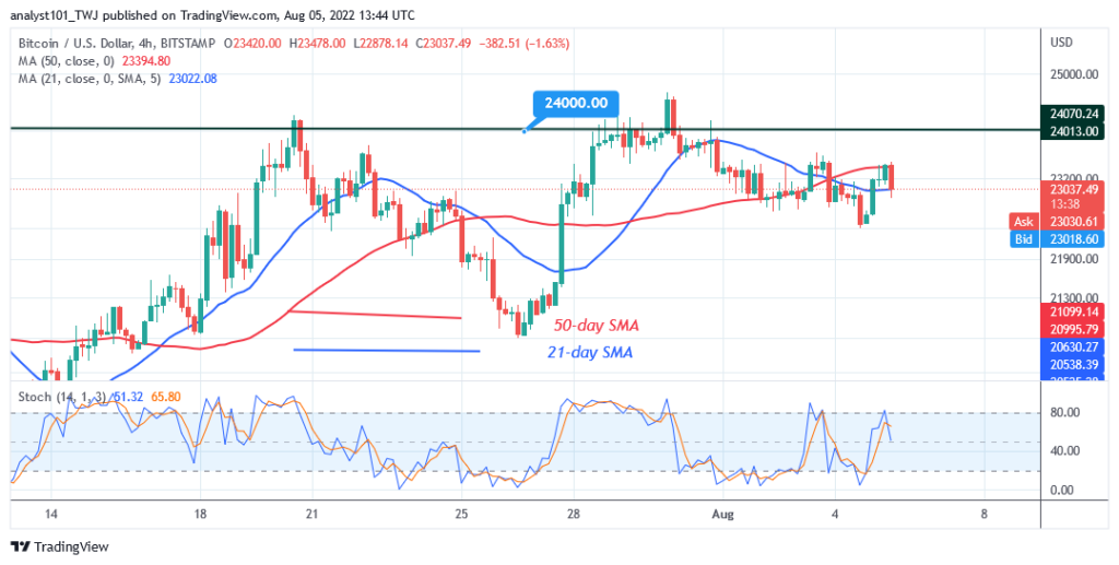 On August 5, Bitcoin declined above the moving average lines. BTC price found support above $22,593.50 and resumed upward. This will be the second time Bitcoin is falling after failing to break above the $24,000 overhead resistance. In the previous retest, Bitcoin declined to the low of $20,724 as bulls bought the dips. On the upside, Bitcoin will rise to retest the $24,000 overheard resistance if the current support holds.