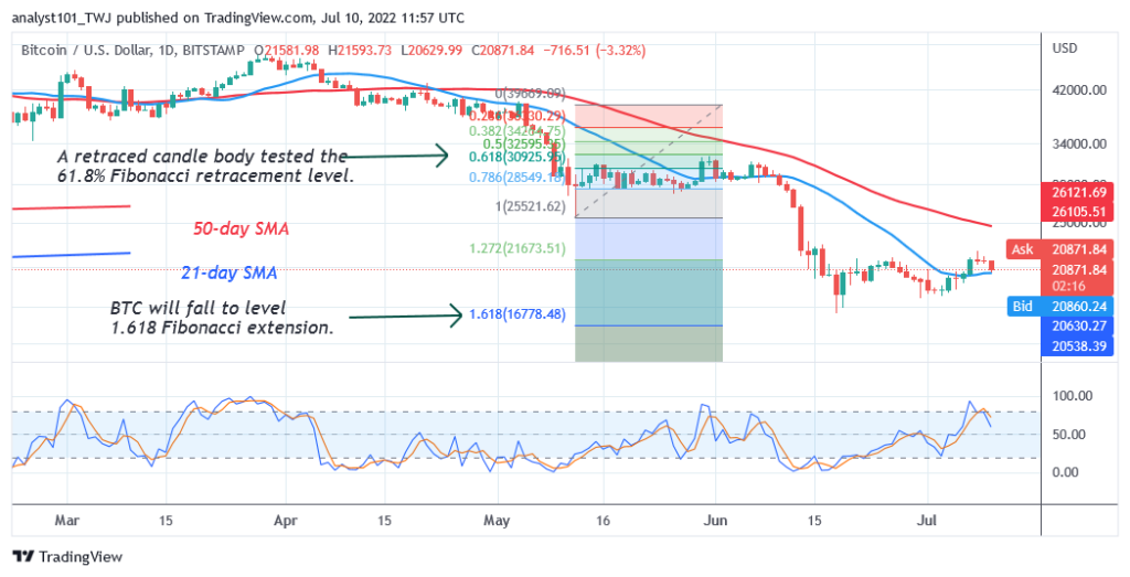 BTC/USD declines to the previous low as it faces stiff resistance at $22.4K. Since July 7, Bitcoin (BTC) has been trading between the moving average lines. In the meantime, the BTC price is retracing to the downside. The cryptocurrency will resume a downward move if price breaks below the 21-day line SMA. Bitcoin will be compelled to a range-bound move if the 21-day line SMA holds.