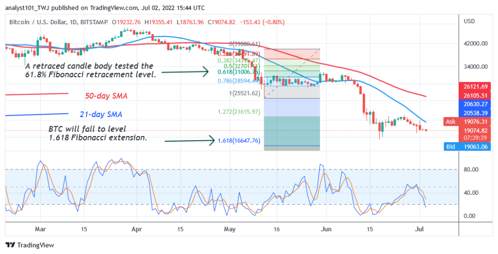 Meanwhile, Bitcoin is declining marginally as BTC price hovers above $19k support. The cryptocurrency risks further decline if the bears break below the $18,800 support. On May 12 downtrend; a retraced candle body tested the 61.8% Fibonacci retracement level. The retracement suggests that BTC will fall to level 1.618 Fibonacci extension or level $16,647.76.