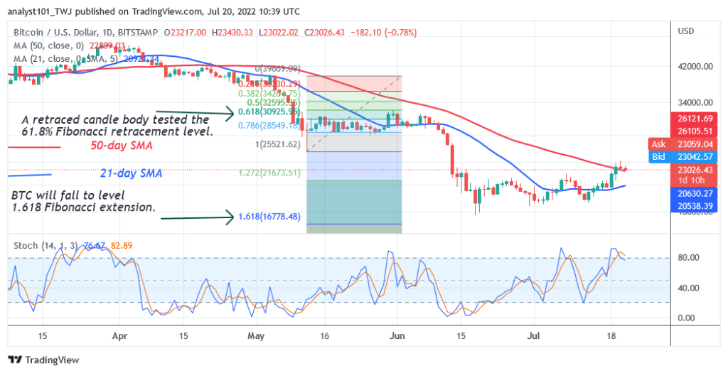 Since July 14, Bitcoin (BTC) has been making positive moves as it broke above the moving average lines. BTC’s price also broke above the $23,377 resistance but was resisted at the $24,276 high. Unfortunately, the bulls could not sustain the bullish momentum above the $24,000 high. The bears are attempting to pull the BTC price below the 50-day line SMA.