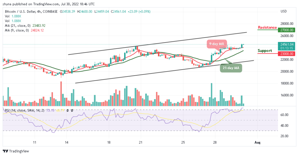 BTC/USD keeps following the bullish movement, and it is likely to start a new trend as the 9-day moving average remains above the 21-day moving average. At the beginning of today’s trading, the Bitcoin price touches the low of $23,651 as it is currently trading at $24,450 and it is likely to settle above the upper boundary of the channel in the next positive direction.