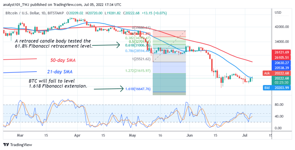 On July 5, Bitcoin recovered again above the $20,000 psychological price level. The largest cryptocurrency recovered because there were no sellers at lower levels to push the crypto downward. BTC’s price is now hovering above the $20,000 support. Buyers will attempt to push Bitcoin to the resistance zones of $22,000 and $23,377. BTC/USD will rally to a $28,360 high. In the meantime, Bitcoin is trading above the $20,000 support as it struggles to break above the 21-day line SMA. Bitcoin will fall and revisit the previous low at $17,605 if Bitcoin faces rejection at the 21-day line SMA.