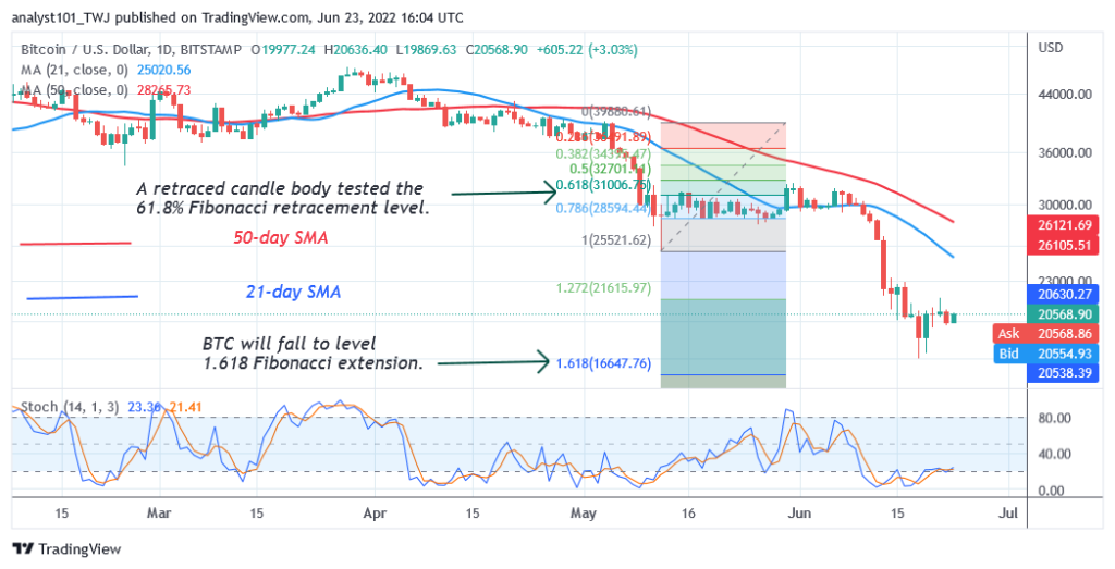 Meanwhile, Bitcoin risks further decline as BTC price is stuck below 22K. The upward move is hindered at $21,179. Meanwhile, on May 13 downtrend; a retraced candle body tested the 61.8% Fibonacci retracement level. The retracement suggests that BTC will fall to level 1.618 Fibonacci extension or $16,647.76.