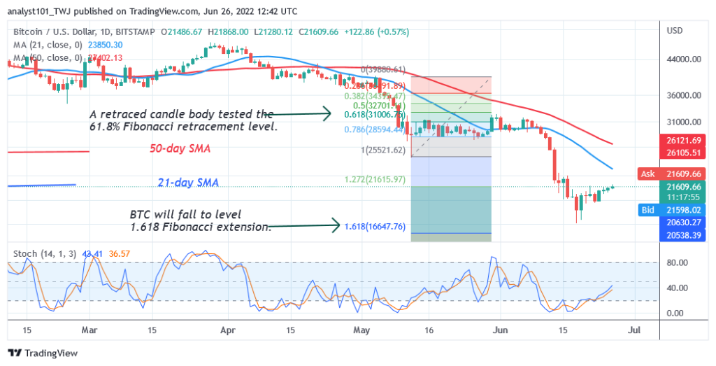 On June 18, BTC/USD declined to $17,605 low as it fails to jump the $21.7K hurdle. Bitcoin has rallied to the high of $22,020 but it is facing rejection at the recent high. Bitcoin bulls have two hurdles to jump. Buyers have to overcome the resistance at $21,675 and $23,010.