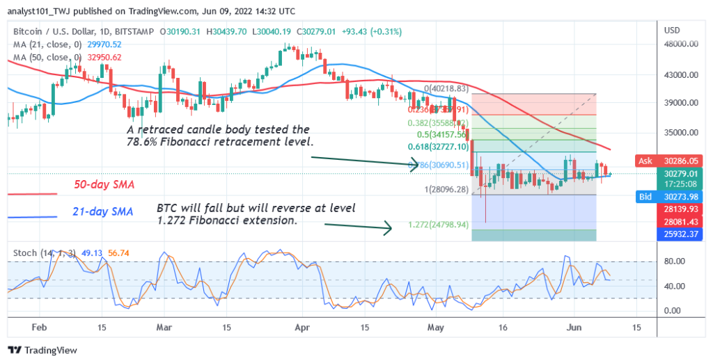 For the past week, Bitcoin (BTC) has been trading above the 21-day line SMA but below the 50-day line SMA. On June 7, the bears broke below the 21-day line SMA as Bitcoin dropped to the low of $29,174. Nonetheless, the bulls bought the dips as Bitcoin recovered above the 21-day line moving average. This has been the price action since May 12. The market could have declined to the low of $28,600 and $26,591 if the bears were successful. Today, the BTC price has recovered as it rises above the $30,000 psychological price level. The bulls will attempt to retest or break the $32,407 high. The bottom line is that the range-bound move will terminate when the $28,600 and $32,407 price levels are breached. For instance, the BTC price will rally above the 50-day line SMA when the resistance at $32,407. The upside momentum will resume when the bullish momentum is sustained above the 50-day line SMA.