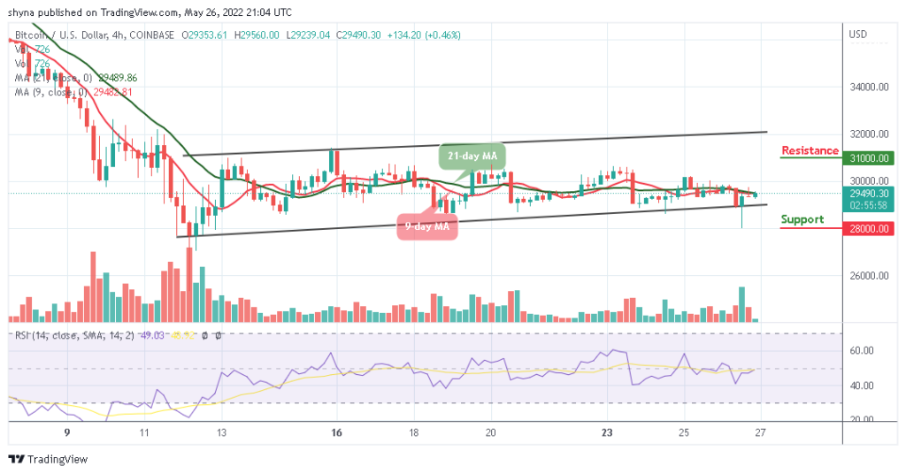 The 4-hour chart shows that the Bitcoin bulls are now stepping back into the market pushing the BTC price to cross above the 9-day and 21-day moving averages. Although the Bitcoin price has not yet slipped below $29,000 in the last few hours, it’s still in the loop of making a bounce back.