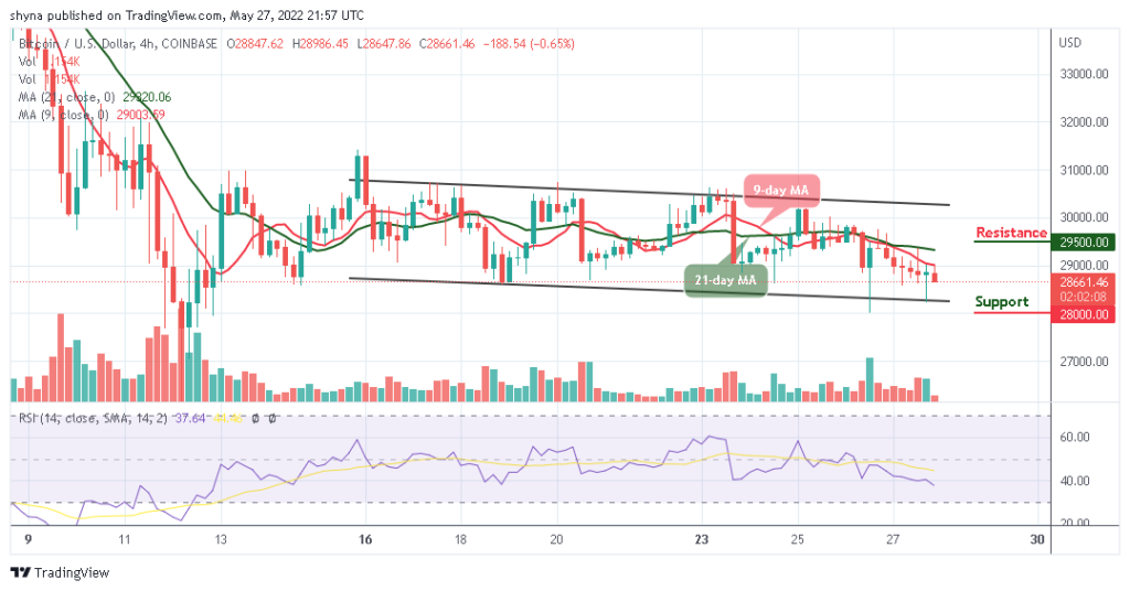 On the 4-hour chart, the Bitcoin price has been ranging as the coin remains below the 9-day and 21-day moving averages. However, the Bitcoin price is likely to return to the bull market if the 9-day MA crosses above the 21-day MA, and higher resistance could be located at $29,500 and above.