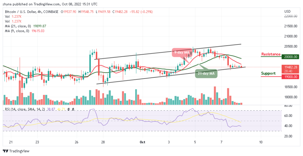 Looking at the 4-hour chart, the Bitcoin price is likely to cross above the 9-day moving average. BTC/USD may cross above the 21-day moving average as the market is trying to recover from the bearish momentum. However, if the price faces the upside, it could locate the resistance level of $20,500 and above.