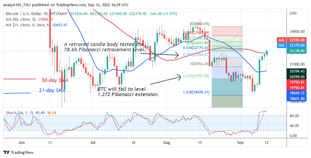 Bitcoin’s (BTC) price breaks above the $22,000 resistance level as it targets the $24K high. However, the largest cryptocurrency is in minor retracement as it fluctuates above $22,000 support. The uptrend may resume if buyers defend the support at $22,000.