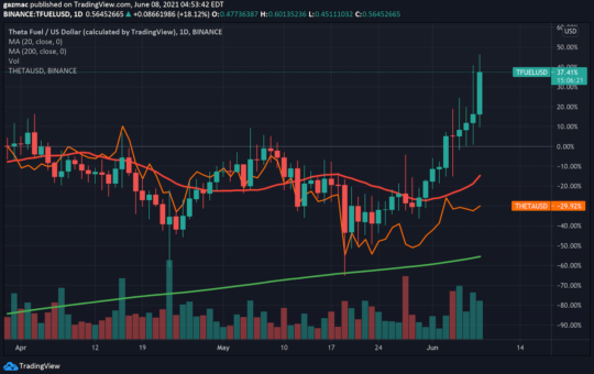 Theta Fuel is rocking the house. The crypto market is a sea of red today but there is one coin...