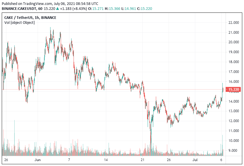 CAKE is trading at $15.18 on major exchanges at the time of writing after an 11.2% gain in the past 24 hours.