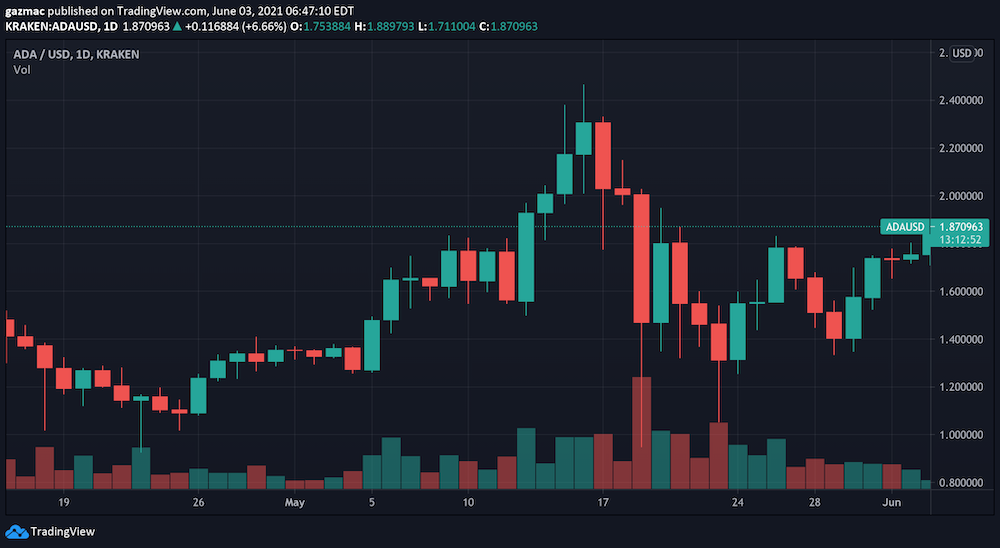 Cardano has suffered the least of the major altcoins in the wake of the May correction pain. The price nudged $1.88 today but has since given up some of those gains as the US session kicked into gear – maybe some crypto buyers prefer the excitement in meme stocks at this point?