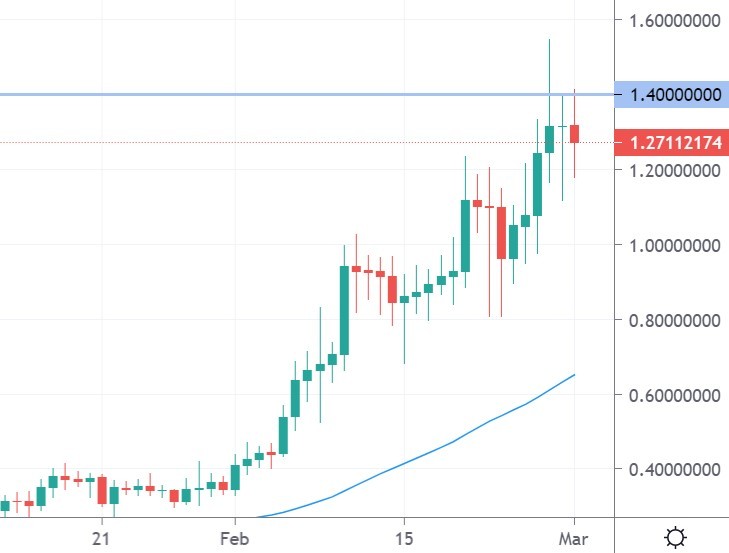 The latest surge capped a very strong February performance for the coin and was driven by a Twitter announcement from the founder that another milestone in the Goguen upgrade had been completed. Hoskinson said:
