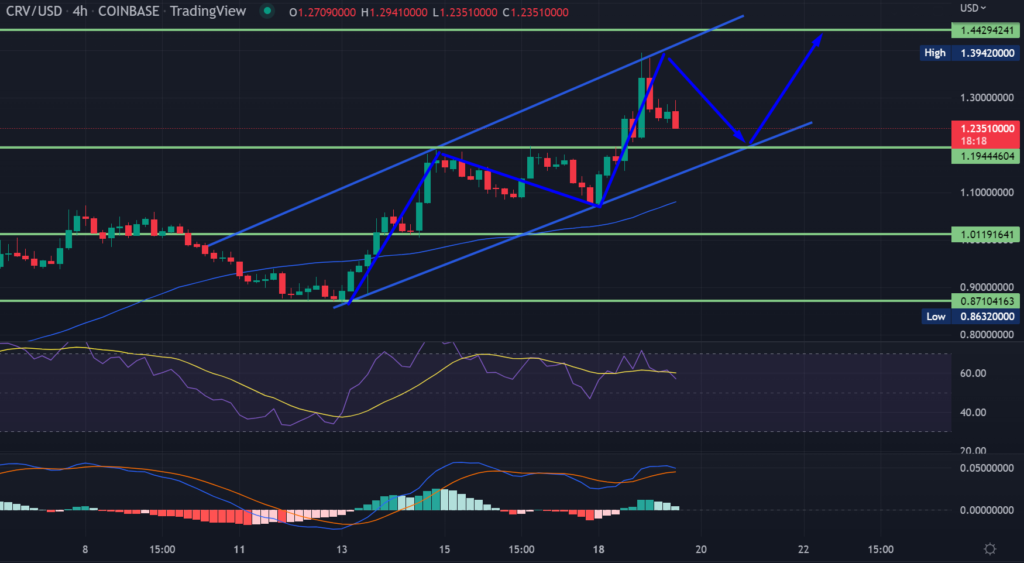 Despite the CRV coin’s strong positive trend, the CRV/USD pair is trading slightly bearish throughout the European session. The CRV/USD pair failed to break beyond the significant resistance level of $1.3870. The CRV/USD currency has established an upward channel in the 4-hour timeframe, supporting the CRV purchasing trend. This increasing trend is expected to support the CRV/USD coin near $1.1944.