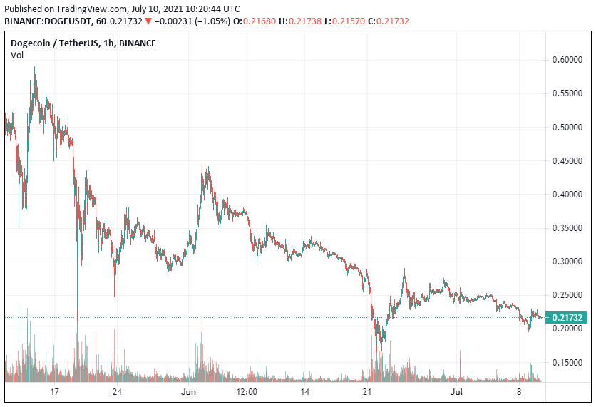 Dogecoin is trading at $0.217 at the time of writing after a 1.6% dip in 24 hours.