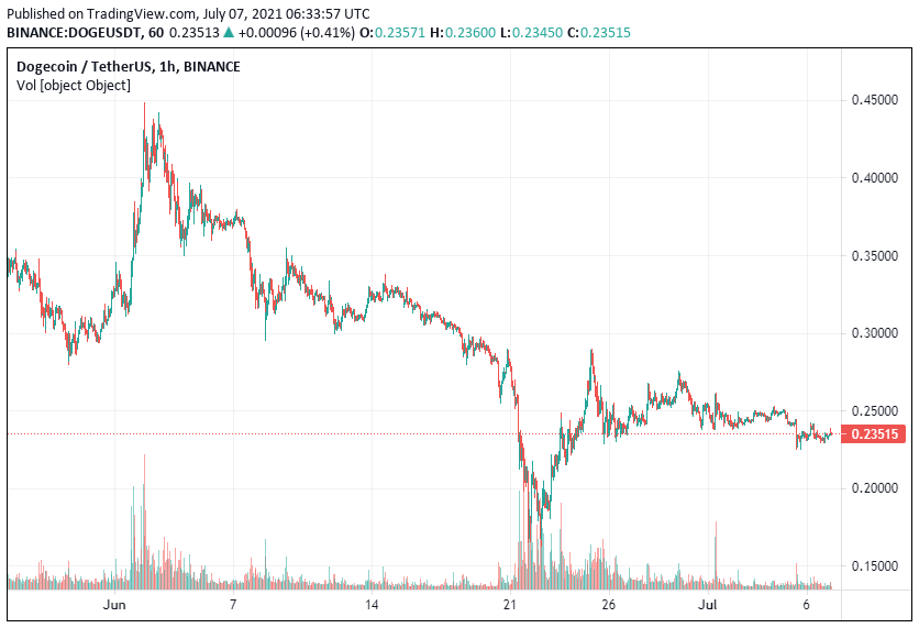 At the time of writing, dogecoin is trading at $0.235 on major exchanges after a 0.7% drop.