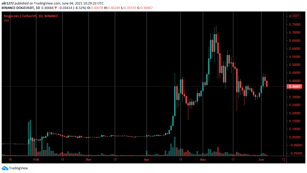 Before we get to Musk, one factor that led to dogecoin’s recovery was its listing on Coinbase Pro, a leading crypto exchange platform. The news of the listing pushed DOGE towards $0.45, but the token has since failed to bypass this level. After the short bullishness, the coin started showing signs of fatigue, and it has fallen below its support level of $0.399.