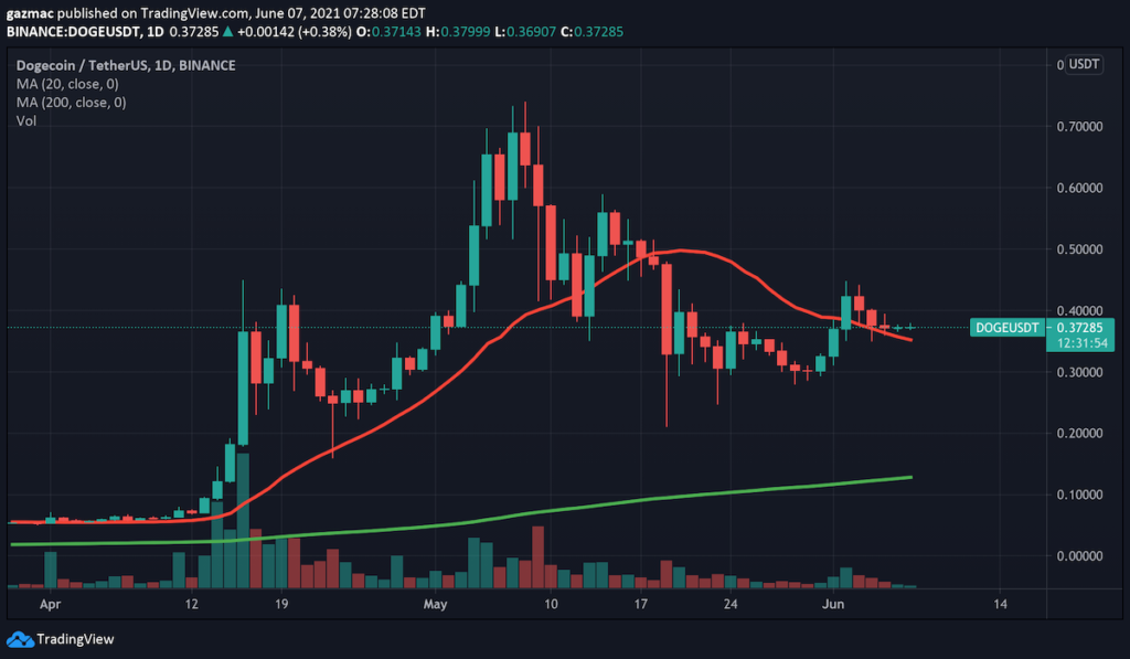 DOGE/USDT price is sitting just above its 20-day moving average (red line in chart above) as bulls ready for another attack on the $0.40 level, where a successful challenge could open the way for further advance. On a bearish note, trading volumes are still falling, down toas little as a tenth of that seen in early May and lower than early June too.