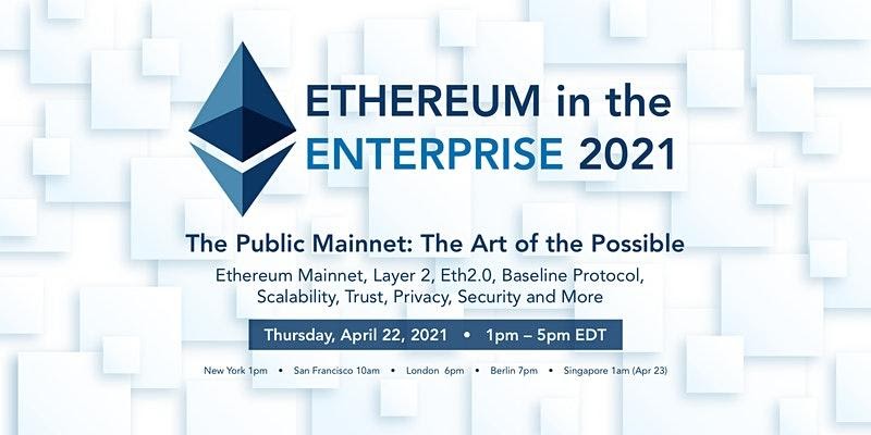 WAKEFIELD, Mass. — April 15, 2021 — The Enterprise Ethereum Alliance (EEA) today announced Ethereum in the Enterprise 2021: The Public Mainnet: The Art of the Possible – a free, half-day virtual event presented by the EEA on Thursday, April 22, 2021, running 1:00 p.m. to 5:00 p.m. EDT. Register free of charge at https://bit.ly/enteth2021.