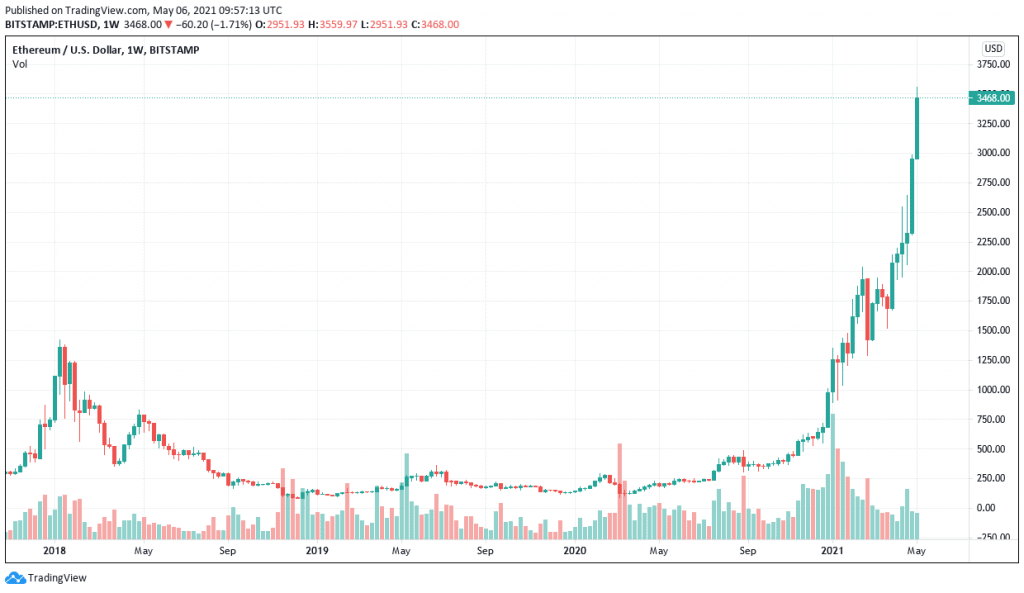 This week has been the best ever for Ethereum (ETH). The coin has rallied past $3,500, which marks its highest value this year, with its market dominance increasing by 17%. Its latest market cap ($398 billion) means the currency is now more valuable than MasterCard, PayPal, and Bank of America.