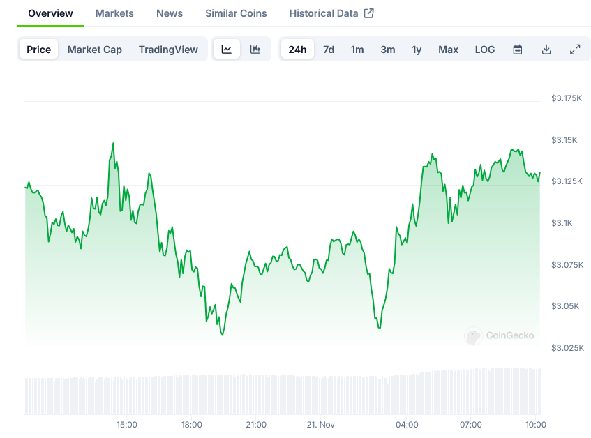 - ETH currently trading around $3,114 with key resistance at $3,200