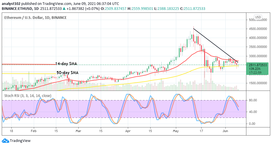 It still appears on the ETH/USD daily chart that the crypto-economy hovers around the lower range-zone of $2,500 that has over the time being kept. The bigger SMA is placed at the point to indicate it as the main determining directional move of the next definite price direction. The 14-day SMA trend-line is located in the range-bound zones pointing toward the east as the bearish trend-line drew slightly across it to the south. It is equally noted that the 50-day SMA indicator is positioned underneath them also points toward the east direction. The Stochastic Oscillators have crossed from the overbought region pointing to the south a bit over range 40. By that, it could be that more downs are in the offing at a later session.