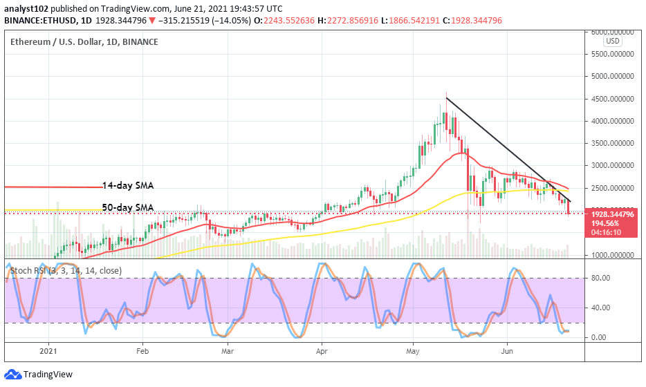 It is now again depicted on the ETH/USD daily chart as it happened last on May 23 while a bearish candlestick emerged to briefly breach past the lower level of $2,000. Yet, price lowers more with a high pressure to create a kind of panicking situation for investors and long-position takers of the crypto economy. The 14-day SMA trend-line has closely moved downward in a state of touching the 50-day SMA indicator. The bearish trend-line drew through the SMA trend lines to the south to find a place on top of the starting formation of the present bearish candlestick. The Stochastic Oscillators are in the oversold region to suggest that near exhaustion of falling forces.